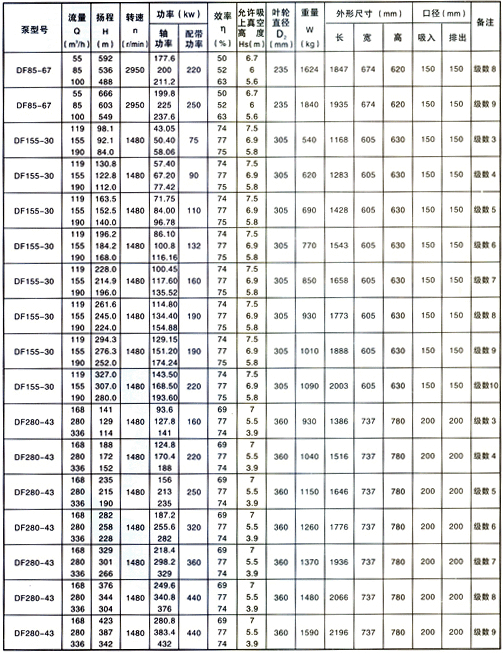 DF型泵供輸送溫度為-20~105℃,不含固體顆粒、有腐蝕性的液體。泵的進(jìn)口壓力小于0.6MPa。DF型泵是臥式、單吸、多級多段式離心泵,泵的出口入口均垂直向上,用拉緊螺栓將泵的吸入段、中段、吐出段聯(lián)結(jié)成一體,泵轉(zhuǎn)子由裝在軸子的葉輪、平衡盤等零件組成。轉(zhuǎn)子兩端由滾動軸承或滑動軸承支撐,滾動軸承用油脂潤滑,轉(zhuǎn)子軸向力由平衡盤平衡。