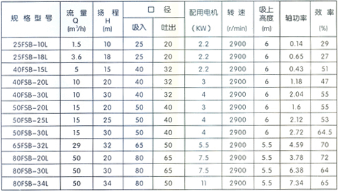 3. 技術規(guī)范及型號意義的說明,F(xiàn)SB(L)型系列耐腐蝕泵共二十種常用型。流程范圍1.5-100m3/時,揚程10-50m.。